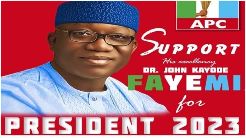 Mr Ayodele is reported to be canvassing support for Dr Fayemi for the 2023 presidential election through the poster which was designed with the logo of the All Progressives Congress (APC).