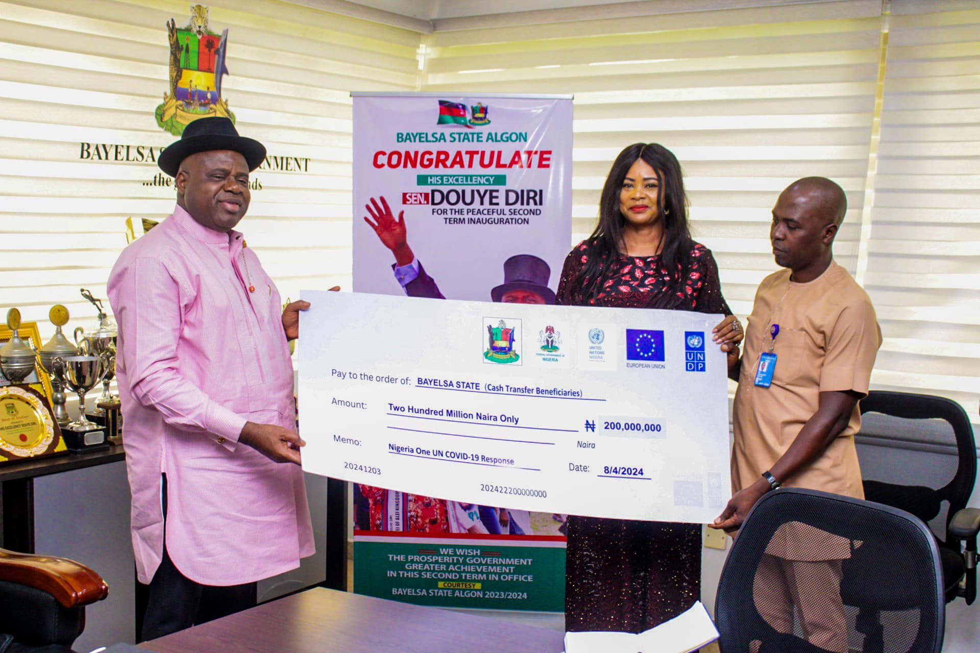 The UNDP team leader, Mrs. Joyce Oburu, while handing over the 200mln symbolic cheque to Governor Diri stated that the primary objective of the project which is co-sponsored by the European Union is to mitigate the social economic challenges and to enhance the growth of MSMEs through targeted intervention and support mechanism.