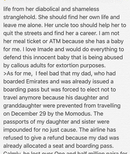 Chief Momodu had responded to the post which generally labelled his niece an unfit mother and extortionist as well as himself a wealth grabber by posting the pictures of Davido after airport officials resisted his attempts to travel out with his daughter as well as seizing the travelling documents of the baby and his half sister, Coco.