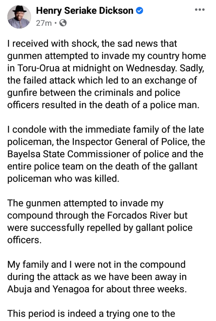 I received with shock, the sad news that gunmen attempted to invade my country home in Toru-Orua at midnight on Wednesday. Sadly, the failed attack which led to an exchange of gunfire between the criminals and police officers resulted in the death of a police man.