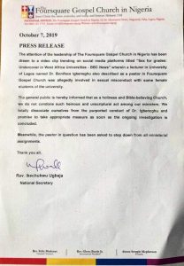 The attention of the leadership of The Foursquare Gospel Church in Nigeria has been drawn to a video clip trending on social media platforms titled “Sex for grades: Undercover in West Africa Universities- BBC News” Wherein a lecturer in University of Lagos names Dr. Boniface Igbeneghu also described as a pastor in Foursquare Gospel Church was allegedly involved in sexual misconduct with some female students of the university.