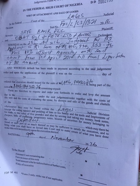 Full Details Of The Court Judgment That Gave Flamboyant Monarch, Obateru Akinruntan’s Cash Cow, Obat Petroleum To Skye Bank Over N1.5billion Debt
