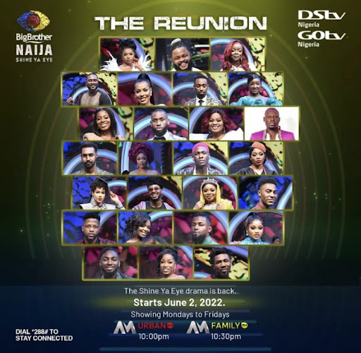 The Shine Ya Eye Reunion Show which will be hosted by Ebuka Obi-Uchendu, promises to be one of the hottest reunions ever. Who will crack under pressure? Who will spill ALL the beans? And Who will bring the heat back to back? Well, tune in to join the conversation with all 26 housemates; Angel, Peace, Jackie B, Tega, Arin, Maria, Liquorose, Beatrice, Princess, Saskay, JMK, Nini, Boma, Queen, Yousef, Pere, Whitemoney, Niyi, Yerins, JayPaul, Saga, Emmanuel, Kayvee, Michael, Sammie and Cross.