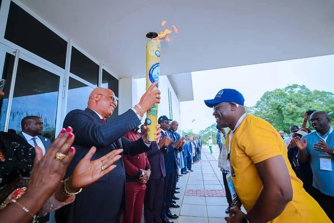 Akwa Ibom State Governor, Pastor Umo Eno, has received the symbolic torch to kick-start the Niger Delta Sports Festival taking place in Uyo.