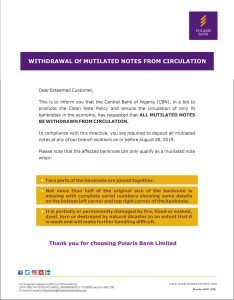 The management of Polaris Bank wrote a personalized letter to customers telling them the deadline for the deposit of such notes – Wednesday, August 28, 2019- and providing education on what falls under ‘’Mutilated Notes”.