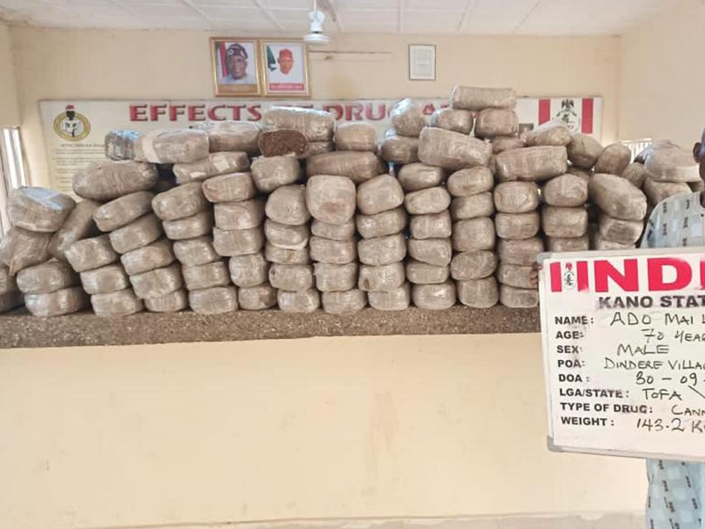 In Kano, a septuagenarian grandpa, Ado Mai Unguwa, 70, was arrested on Saturday 30th September with 143.2kgs skunk in Dindere village, Tofa LGA, while operatives in Enugu same day recovered 110.6kgs of same substance from a locked-up shop at Aria new market.