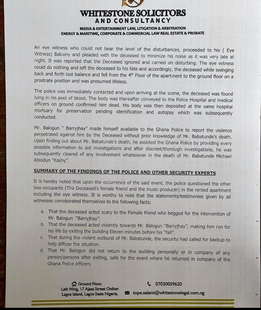 According to the summary of the findings of the Ghananian police and other security experts presented in the statement, the police questioned the other two occupants (Kashy’s female friend and the music producer) in the rented apartment including an eye witness.
