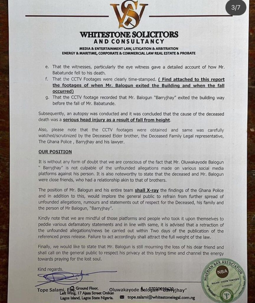 g. That the CCTV footage recorded that Mr. Balogun “Barryjhay” exited the building way before the fall of Mr. Babatunde.”