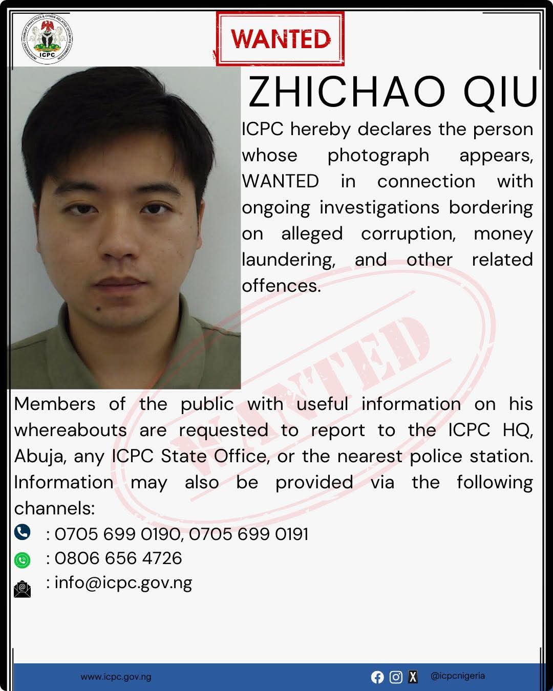 Nigeria’s anti-corruption agency, the Independent Corrupt Practices and Other Related Offences Commission (ICPC), has declared a Chinese national, Zichao Qiu, wanted in connection with an ongoing investigation into alleged corruption, money laundering and related offences.
