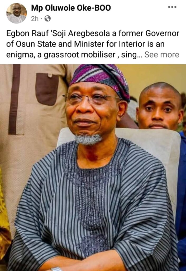 “Baba Kabiru (Aregbesola) is a factor in Osun politics,” Oke signed off in his social media post, which he opened with: “Egbon Rauf ‘Soji Aregbesola, a former Governor of Osun State and Minister of Interior, is an enigma, a grassroots mobilizer, a singer, and a dancer. He is a factor and a BRIDE in Osun politics—truth be told.”