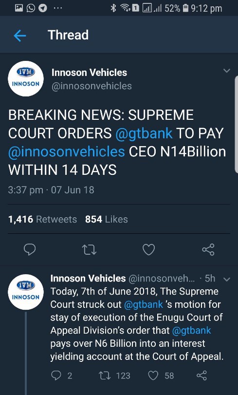 However, Nigerians on social media did not miss this. “I wonder why Innoson Vehicles deleted the tweet claiming Supreme Court ordered GTBANK to pay them N14bn?! ” wrote one Twitter user.