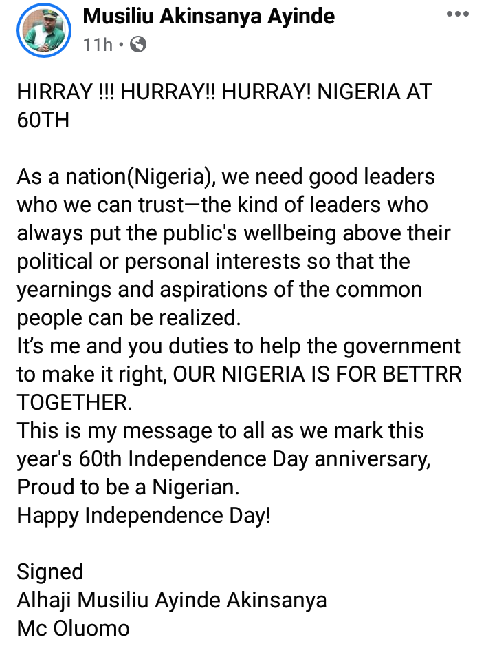 ‘’It’s Me And You Duties To Help The Govt’’ Inside NURTW Chairman MC Oluomo’s Independence Day Message