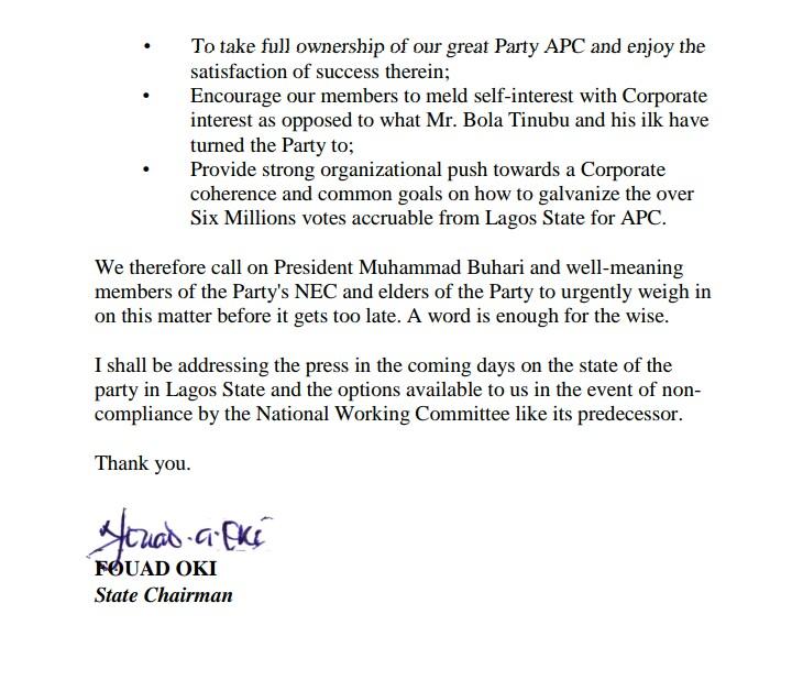 Factional Chairman of the Lagos state chapter of the All Progressives Congress, Fuad Oki has come hard on political leader, Asiwaju Bola Ahmed Tinubu.