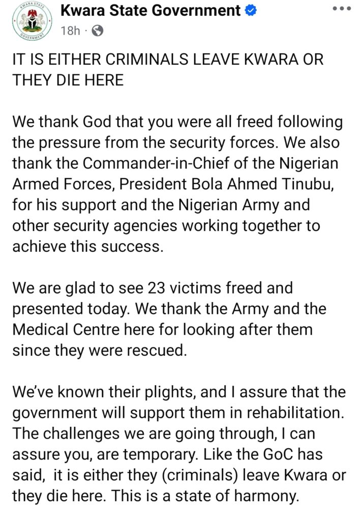 “We thank God that you were all freed following the pressure from the security forces,” AbdulRazaq said, adding “We also thank the Commander-in-Chief of the Nigerian Armed Forces, President Bola Ahmed Tinubu, for his support, and the Nigerian Army and other security agencies working together to achieve this success.”