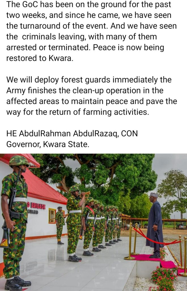 He praised the Nigerian Army for its sustained efforts in flushing out bandits and restoring calm, noting the visible improvements since the GoC assumed direct oversight of the operations. “The GoC has been on the ground for the past two weeks, and since he came, we have seen the turnaround of events. We have seen the criminals leaving, with many of them arrested or terminated. Peace is now being restored to Kwara,” the governor said.