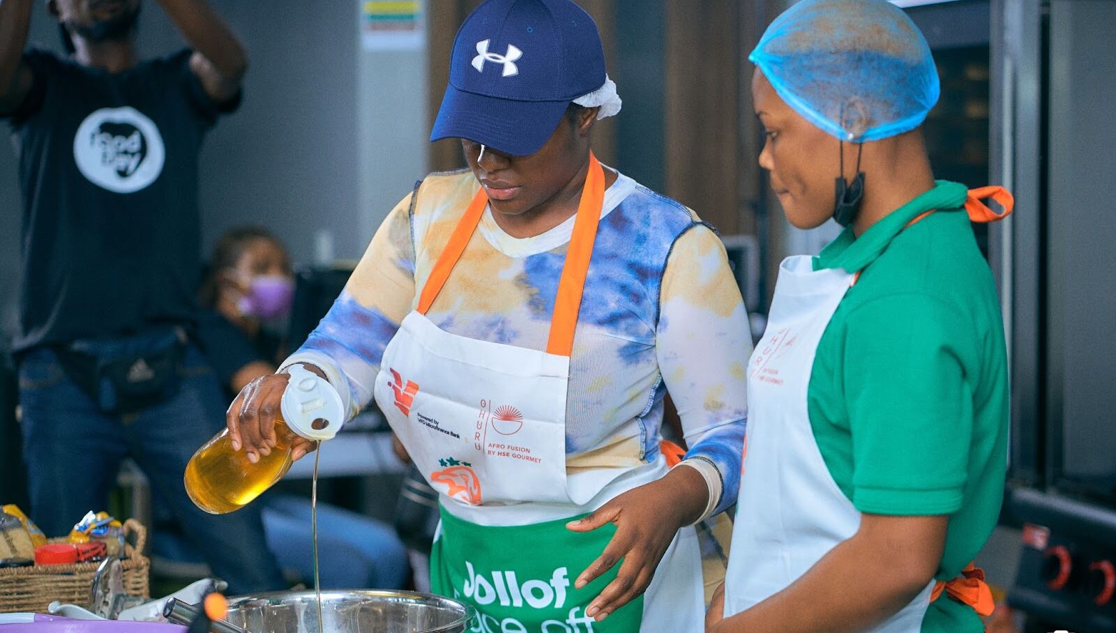 Winning Chef, Hilda Effiong Bassey cooking with her assistant at the ‘Jollof Faceoff’ in Lagos, Nigeria recently.