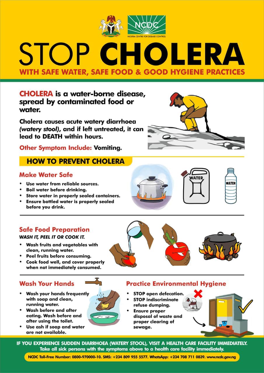 Please be careful of the food and water you take, because cholera is caused by water or food contaminated with faeces.