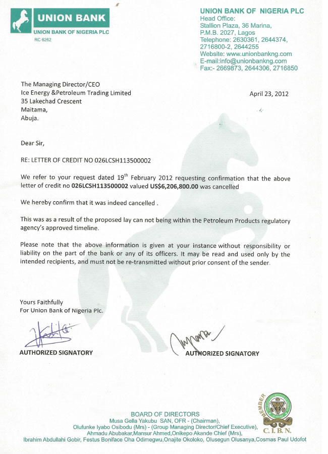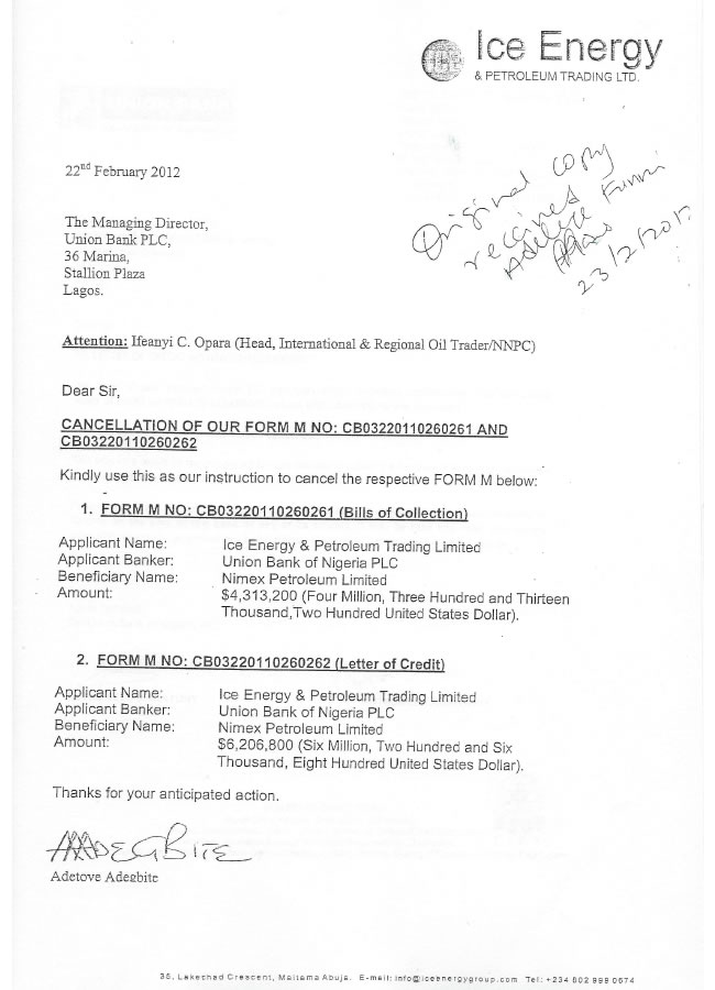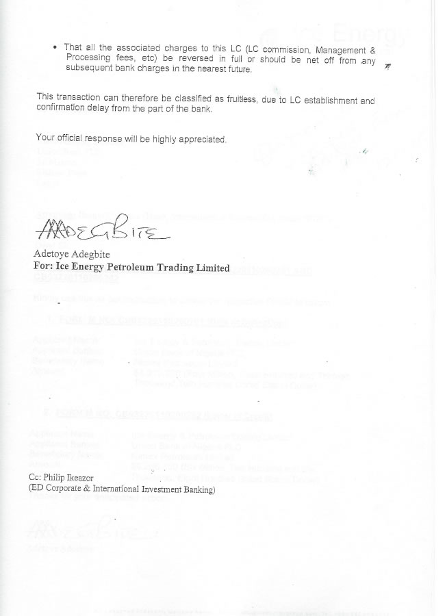 However the affected Oil firm, Ice Energy has absolved the bank boss- with documents to prove.
