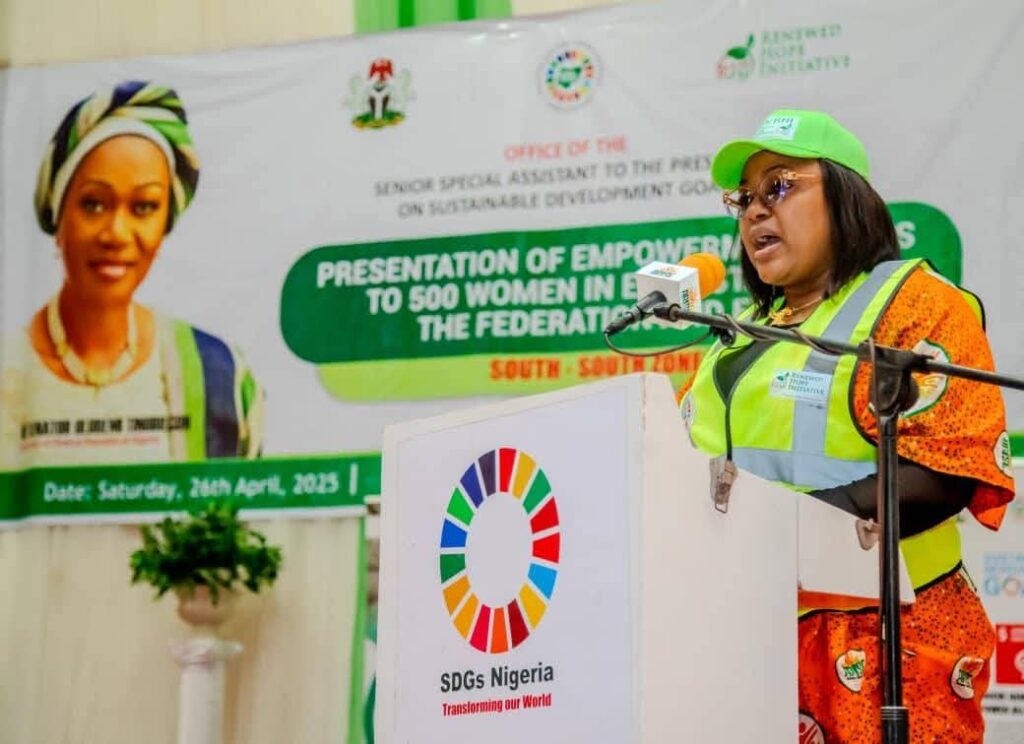 At the empowerment programme held on Saturday, April 26, 2025, at Ibom Hall, Uyo, Nigeria’s First Lady said the programme organised through her platform, Renewed Hope Initiative (RHI), was in partnership with office of Senior Special Assistant to the President on Sustainable Development Goals, in recognition of the vital role women play in nation building.