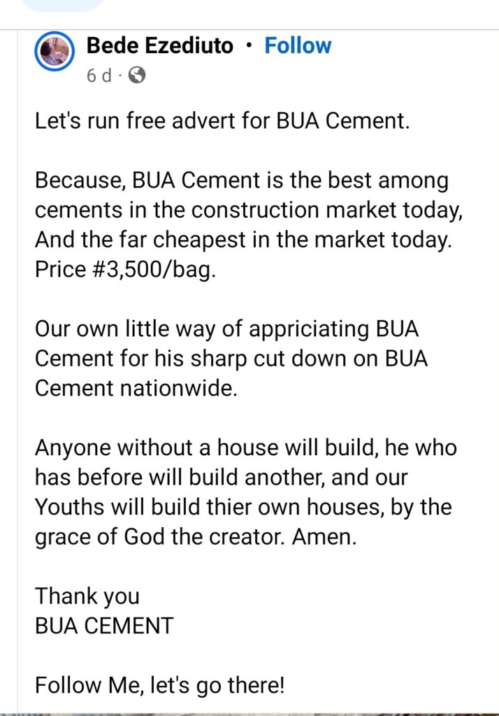 SocietyNow.Ng’s checks revealed this appreciation of BUA Cement’s price reduction went viral last week.