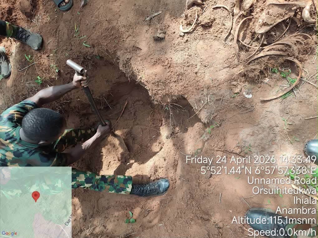 Acting on intelligence information, the operation, conducted on 24 April 2026 along the Ubaha Orsu axis of Orsu Local Government Area, was part of a deliberate clearance and search mission aimed at dismantling IPOB/ESN hideout within the region and locating the remains of two personnel of the Nigerian Army, Master Warrant Officer Linus Musa Audu and Private Gloria Mathew, who were brutally abducted and murdered by IPOB/ESN terrorists in May 2022 while en route for their traditional wedding.