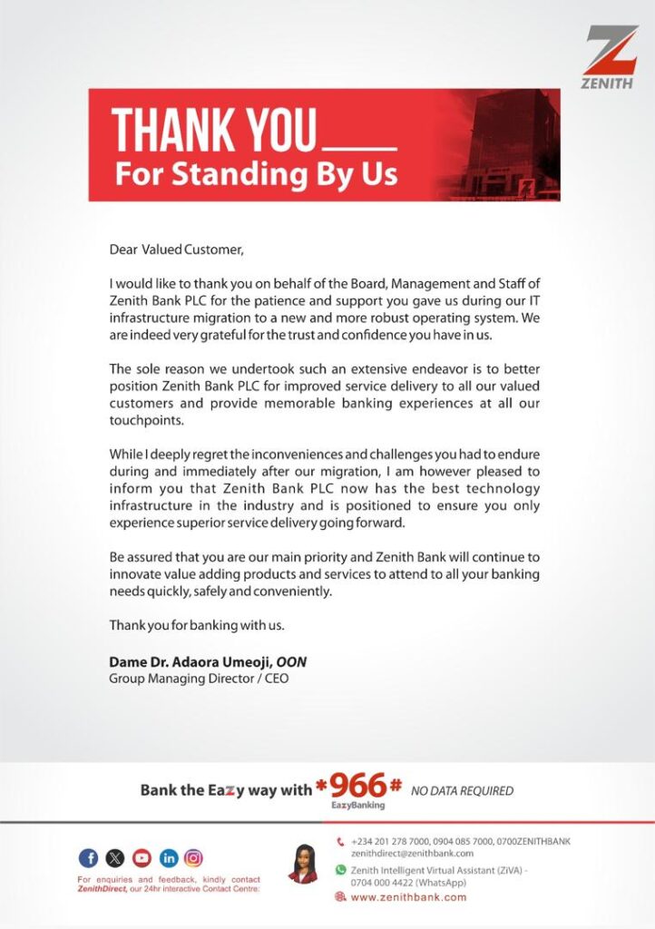 “The sole reason we undertook such an extensive endeavor is to better position Zenith Bank Plc for improved service delivery to all our valued customers and to provide memorable banking experiences at all our touchpoints,” said the CEO, who apologised for inconveniences and challenges customers experienced during the upgrade.